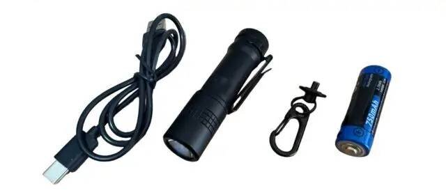 Set contents / E5 flashlight main unit ×1, lithium-ion rechargeable battery ×1, USB Type-C charging cable ×1, keyring-integrated carabiner ×1, instruction manual ×1