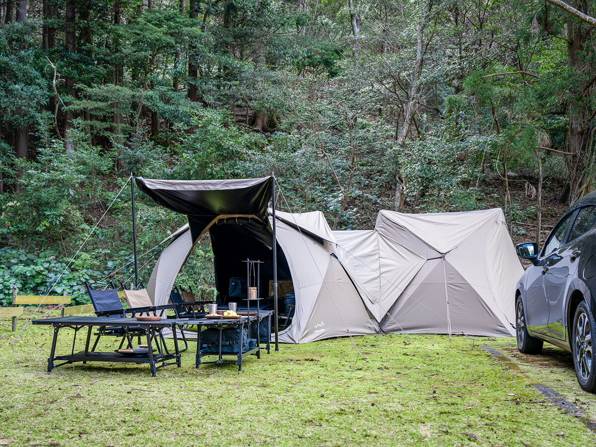 One more thing to note is the "Hexagonal Camp Shade Tunnel L". It's easy to adapt to layouts that separate the living space and the sleeping area, enhancing usability for groups and families. When stored, it's compact at W26×D41×H9cm and weighs 1.4kg. It's great that you can move between the living room and bedroom without getting wet, even on rainy days!