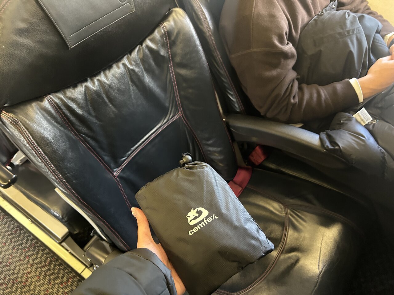 To enjoy traveling by plane, I got a new "portable lumbar cushion." Its ease of use in just 30 seconds is noteworthy, and it supports the correct posture, making my steps remarkably light after arrival.