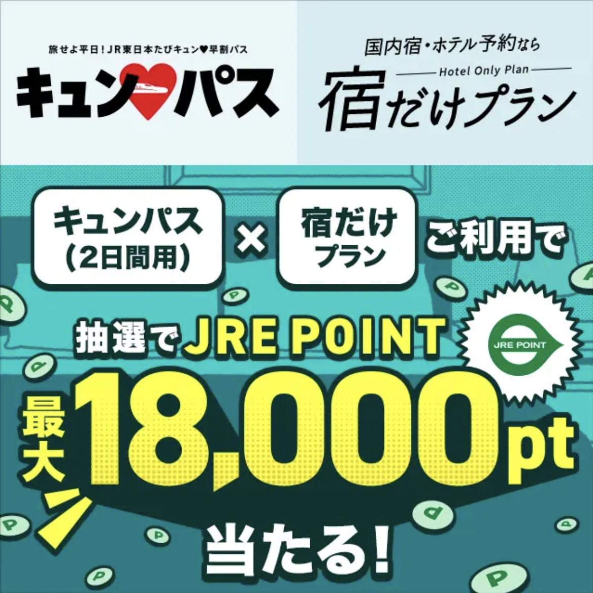 For a two-day "Kyun♥ Pass" combined with the "Accommodations Only Plan" from Eki-net, there is a campaign where you can win up to 18,000 JRE POINTs through a lottery. By seamlessly arranging both travel and accommodation, it not only allows you to tour sightseeing spots but also enhances the quality of time spent in the area.