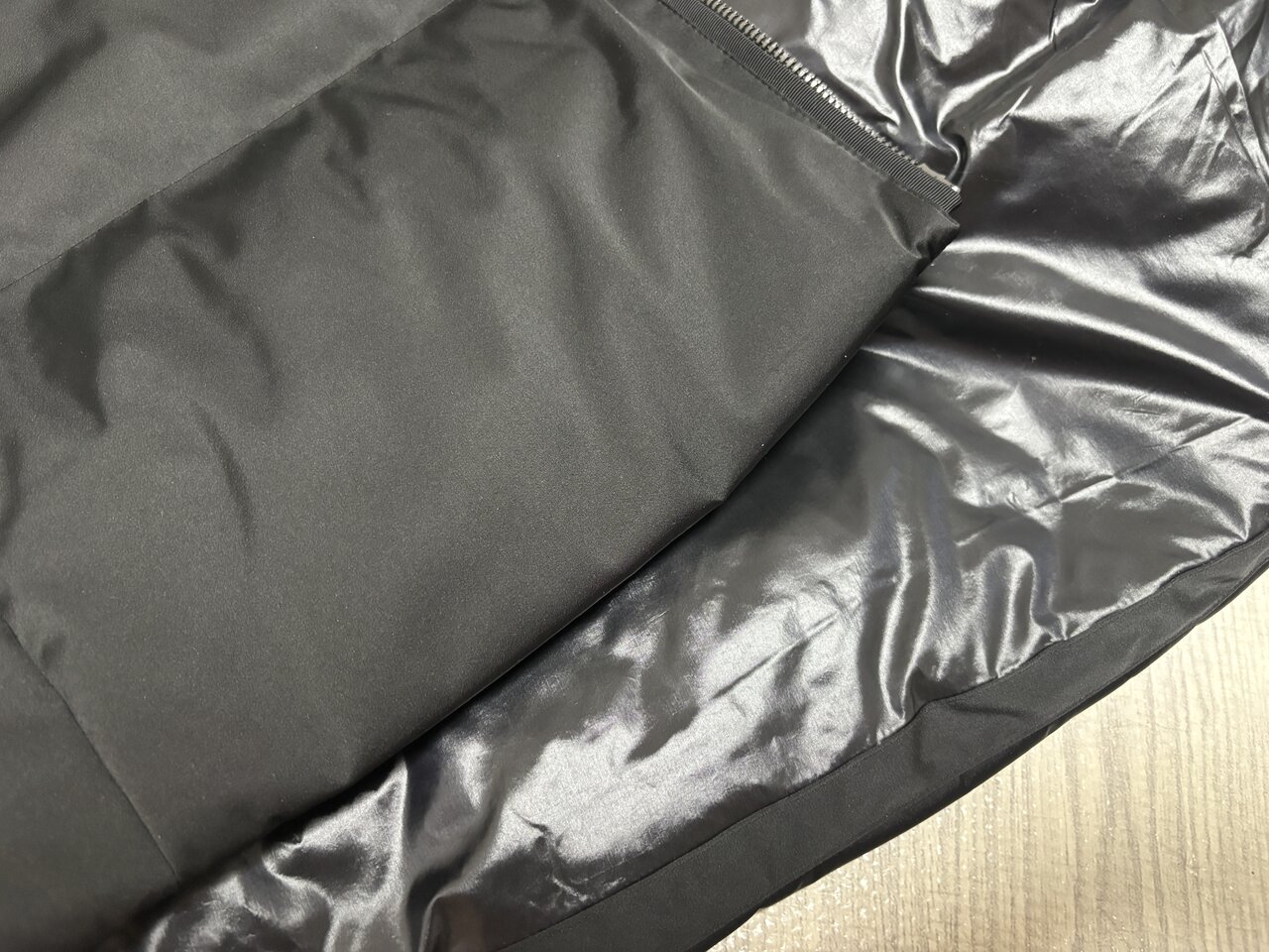 上品な光沢のあるサテンポリエステル素材なので、カジュアルになりすぎず、街中でも浮きにくい。撥水加工が施されているため、小雨や雪の日でも気兼ねなく着られる点も、実用面で助けられています。