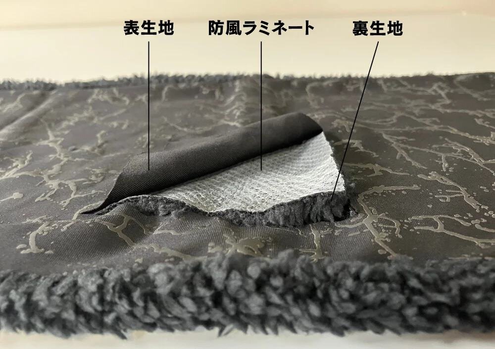 裏地には肌触りのよいふわふわのボアを使用。防風フィルムをボア側に貼り合わせているので、風を通さず高い保温性を実現します。防風フィルム特有の「シャカシャカ音」も気にならず、ストレスフリーです。