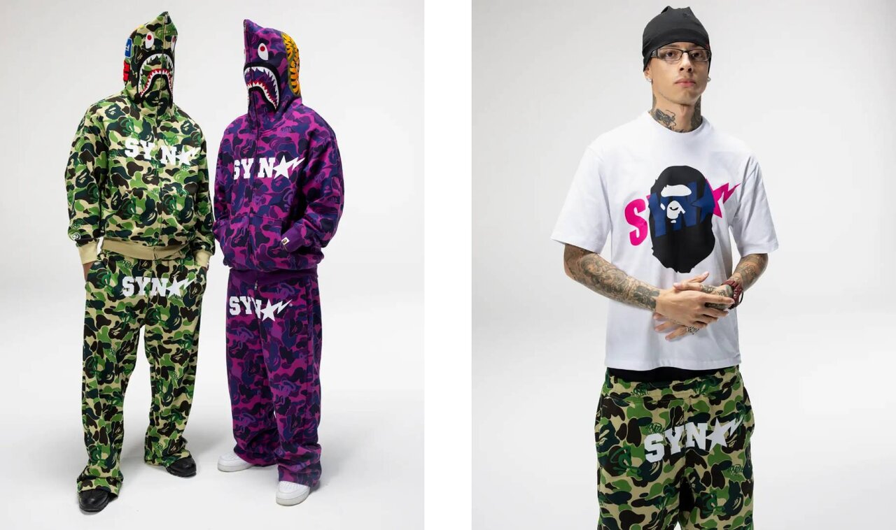 今回のカプセルコレクションは、ヒップホップカルチャーのアイコンとして語り継がれる“パープルのBAPEフーディー”からインスピレーションを受けたもの。ブランドを象徴するCAMOパターンにSYNAのロゴを重ね、過去の名シーンへの敬意を込めながら、新しいCAMOとして再構築されています。