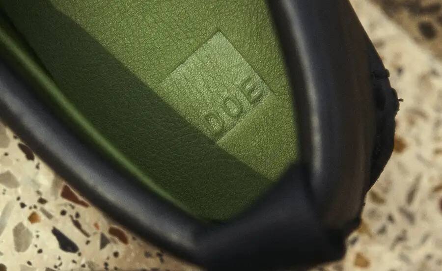DOEらしいミニマルな美学をカラーリングで表現。アッパーは徹底したオールブラックでまとめ、ライニングに控えめなグリーンのアクセントが効いています。主張し過ぎないのに、近くで見るとディテールにこだわりを感じるデザインバランスです。