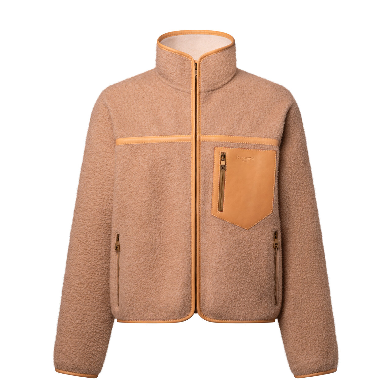 素材は、カシミヤ100%のダブルフェイス。クラシカルなキャメルカラーに、エッジやヨーク、胸元にはヌメ革のトリミングが施されています。ファスナー付きのレザー胸ポケットには、シグネチャーをさりげなくあしらうことで、さりげなく気品を漂わせてくれる仕上がりです。