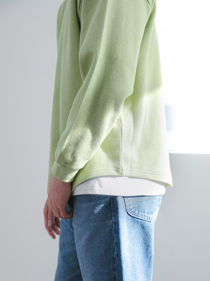 最新の別注コレクションでは、ブランドのアイデンティティを尊重しつつ、今の気分にフィットするリラックス感を追求。コレクションの核となるのは、重厚感のある鹿の子編みを採用した「THICK PIQUE」素材です。しっかりとした肉厚な質感でありながら、肌離れが良く通気性に優れているため、春先から夏にかけての長いシーズンで活躍する特別な一着に仕上がっています。