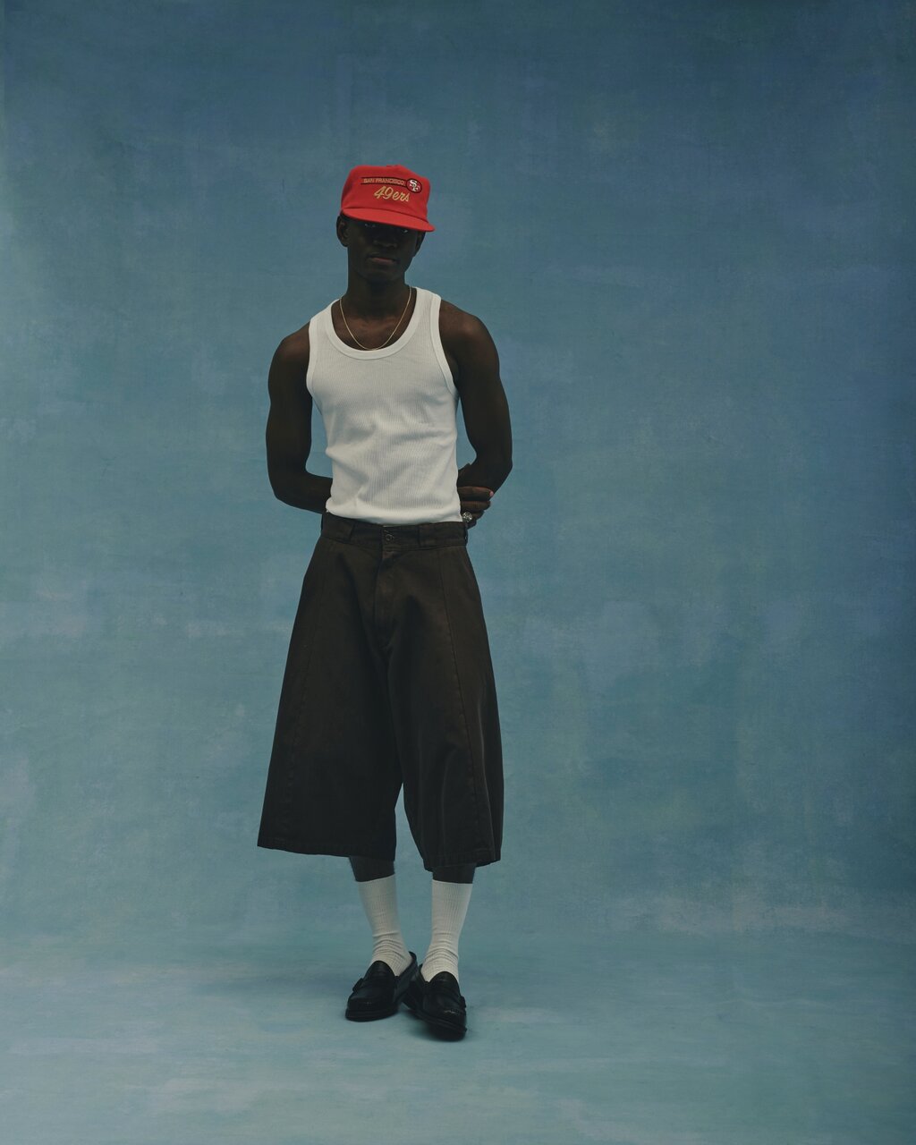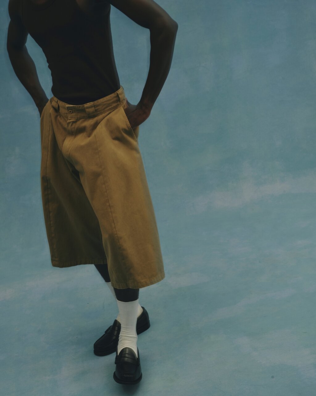 本作が提示するのは、単なるビッグシルエットではありません。ベースとなっているのは、膝下レングスのルーズフィットモデル「42283」。そこに、25SSシーズンで話題を呼んだ「Vertical Cut(垂直切り替え)」の手法が取り入れられることで、まるで2本のショーツを繋ぎ合わせたかのような独特のフォルムを生み出しています。