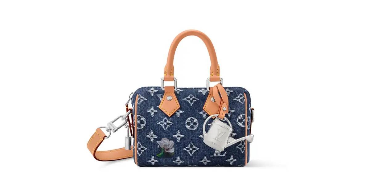 モノグラム·フラワー デニムに、レザーのトリミングが、引き締まった印象を与えます。取外しと調節が可能なストラップが付属しているため、手持ちだけでなく、斜め掛けも可能です。メタリックなジョウロのチャームがさりげないアクセントとなり、遊び心を忘れないスタイルに仕上がります。