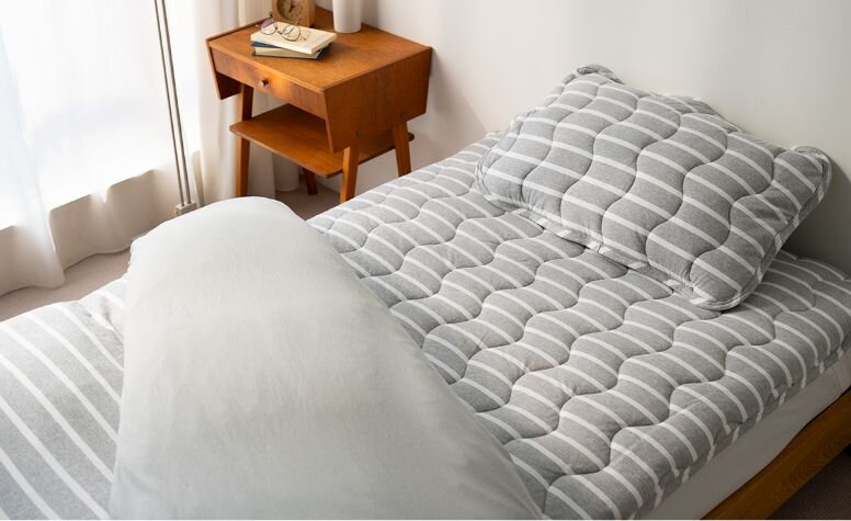 敷きパッドや掛けカバーも揃い、寝室全体が柔らかな空間に。自分だけでなく、子供たちの肌に触れるものだからこそ、妥協のない安全な素材選びを大切にしたいものです。