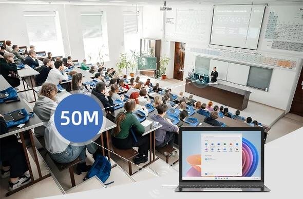 最大50m先でも安定して映像が映し出せる高性能チップを搭載。大きな会議室や部屋の中でも安心して使えます。ミラーモードでは送信元の画面をそのまま共有、拡張モードでは投影先と手元のパソコン画面を別々に操作可能です。