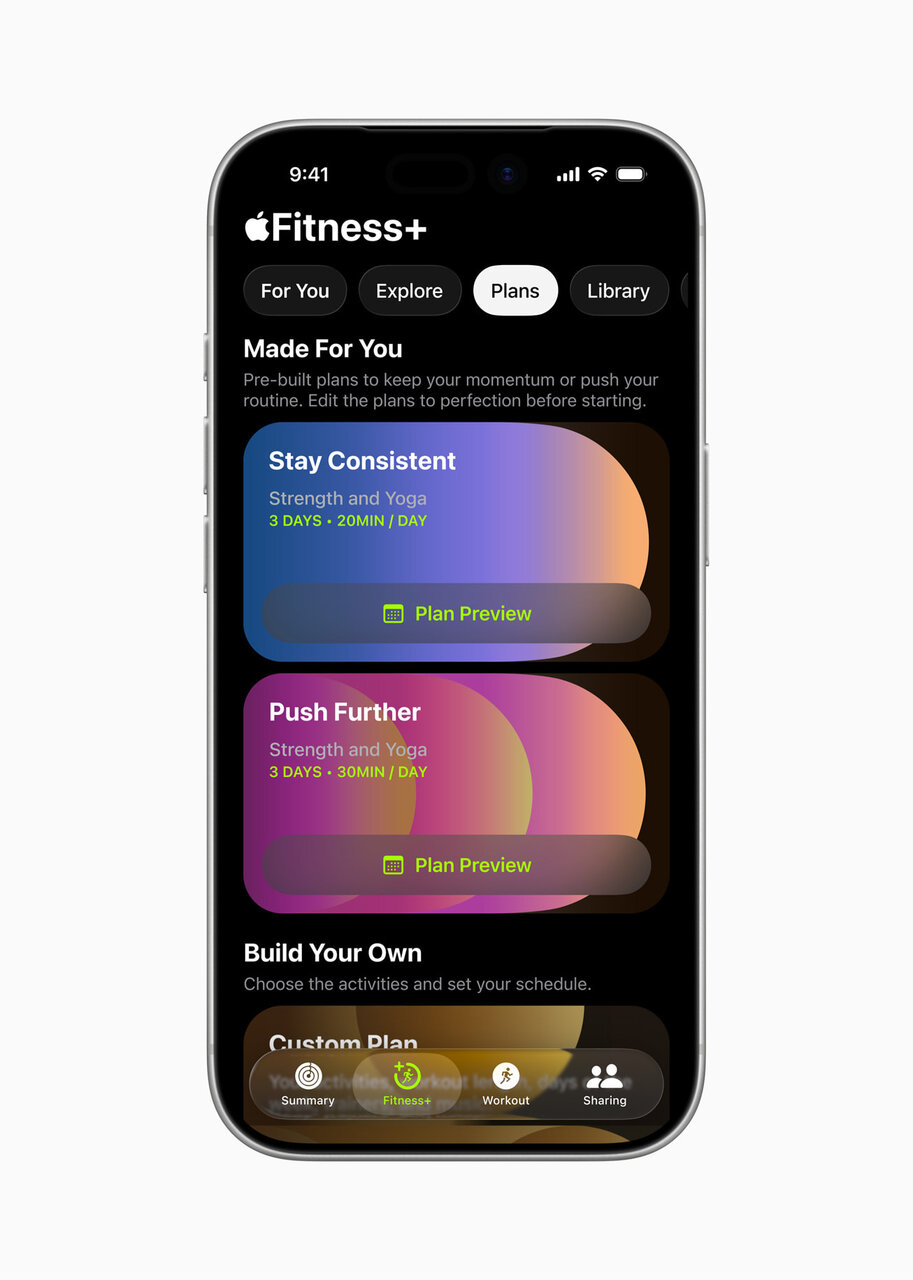 2026年から「Apple Fitness+」を日本でも利用できるように。筋力トレーニング、ヨガ、サイクリングなど12種類のワークアウトが楽しめます。スケジュールの自動作成にも対応していて、“脱ズボラ”に貢献してくれそうだ!