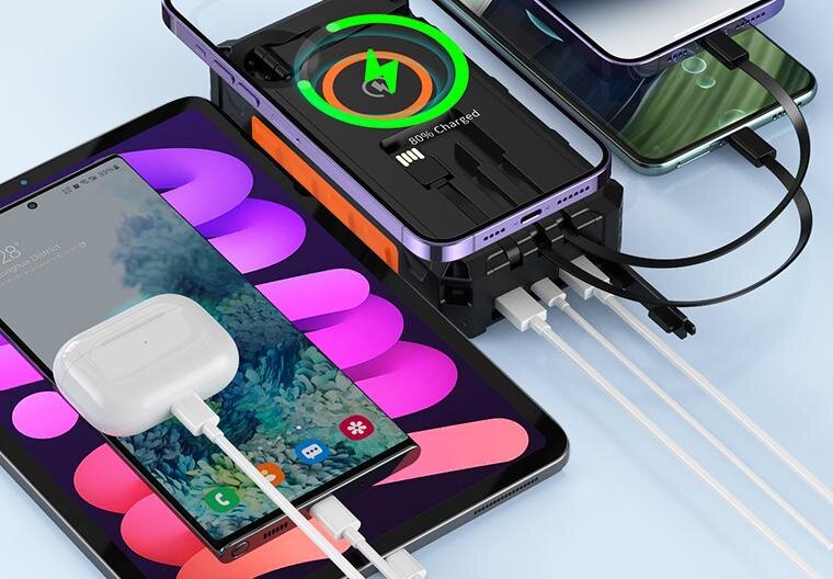 バッテリー容量は頼れる40000mAhで、スマホなら複数回のフル充電に対応。さらにワイヤレス充電や内蔵ケーブルを含む複数の出力により、最大6台まで同時に充電が可能。停電時の電源ステーションとして機能してくれるのも心強いポイントです。