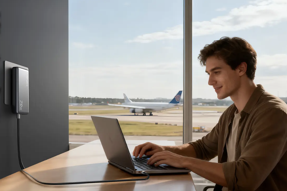 名前のとおり、70Wのハイパワーを誇りながら"79.5g”という超軽量設計。スマホ並みの薄型デザインなので、飛行機や新幹線の座席、隙間の狭いコンセントでもスッと充電器を挿し込めます。