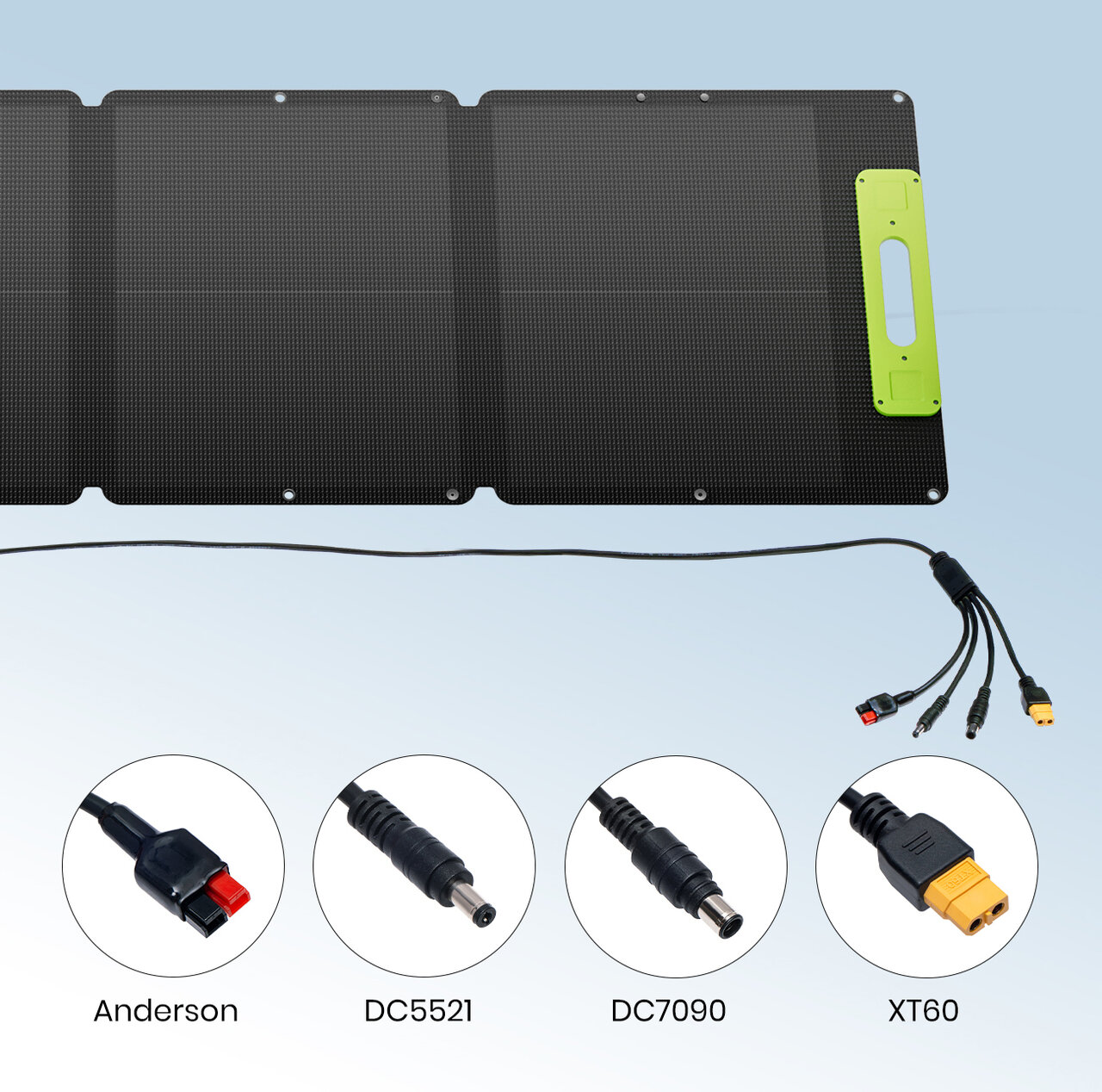 充電ケーブルは4in1で、市販のポータブル電源にほとんど対応できます。搭載されているのは、Anderson、DC5521、DC7090、XT60。キャンプやフェス、災害時に備えて持っておきたい、頼もしい一台です。
