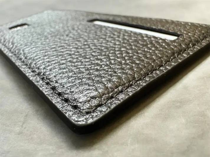 厚さわずか3mm・約18gという薄型軽量設計。サイズは横6.5cm×縦9.5cmで、一般的なカードサイズにぴたりと合うコンパクトさ。長財布のカードポケットに差し込んでも膨らまず、ミニ財布やジャケットの胸ポケットにもスッと収まります。