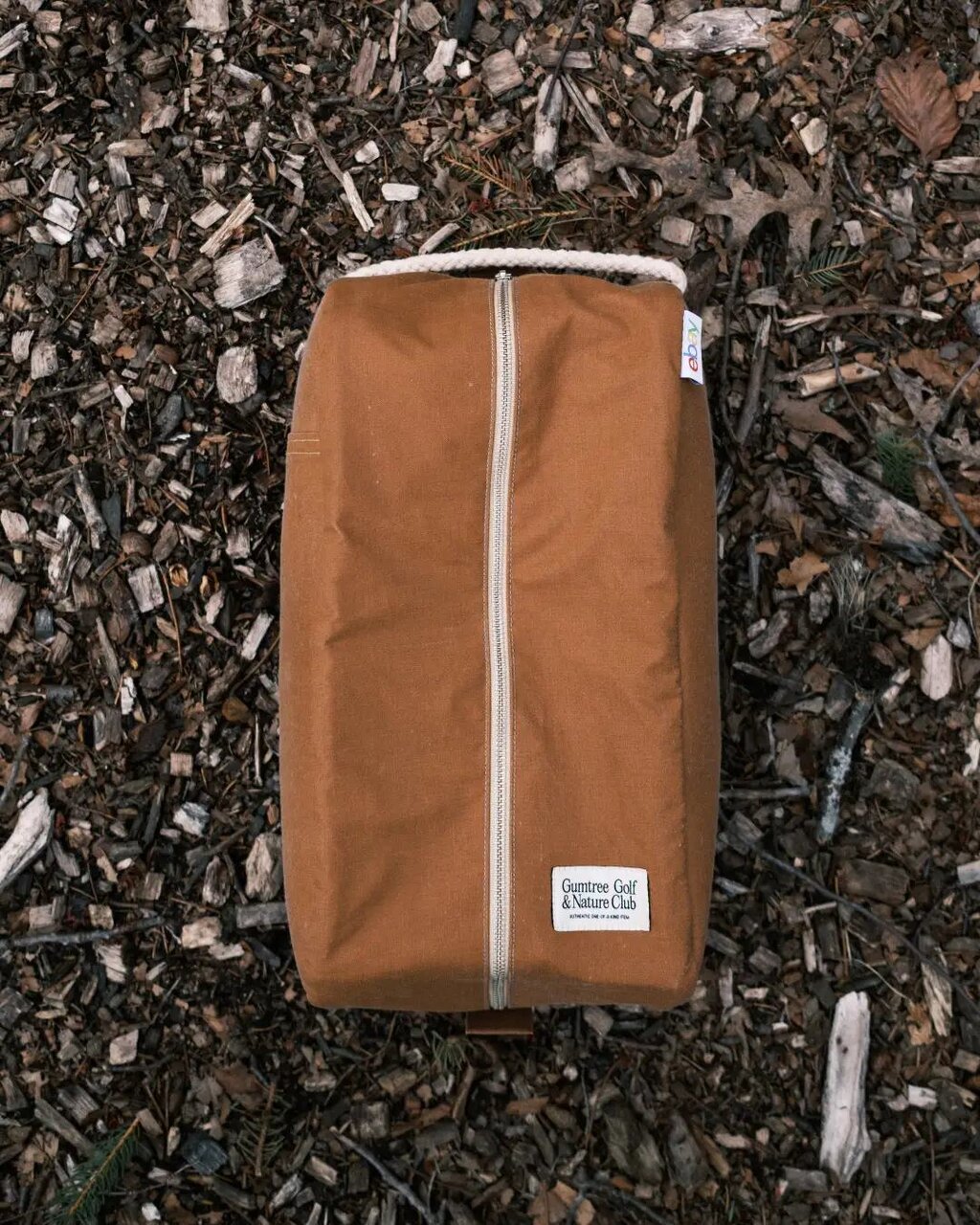 限定コレクションのアイテムは、ヘッドカバーとシューズバッグの全2型展開。素材にはイーベイで購入された1950年代のキャメルカラーのキャンバステントを使用し、アメリカ各地から収集されたヴィンテージ生地をアップサイクルしています。