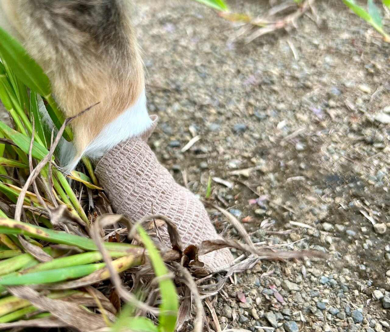 足先だけを巻きつけると走った時にスルッと取れてしまうので、ちょっと上の方まで巻きつけるのがコツ。上の画像くらいまで巻きつけると、散歩の途中で外れることなく最後の最後まで足をカバーしてくれました。