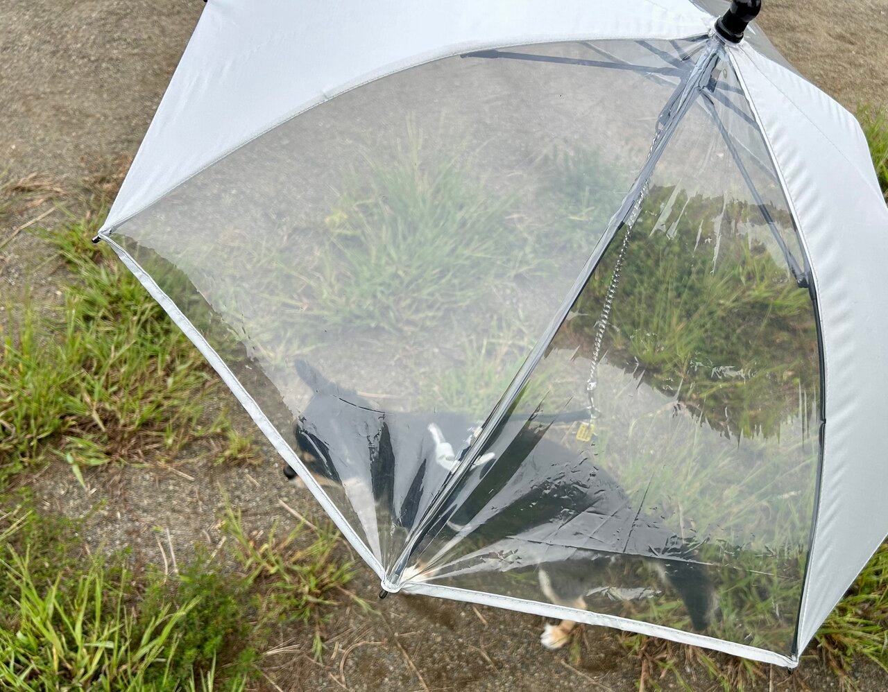 筆者が一番気に入ったのは、傘地が透明になっている点。愛犬の様子を観察できるだけでなく、足元の状況をチェックしながら散歩できるので安心です。本体重量も約260gと軽いので、負担なく使えるところも助かります。