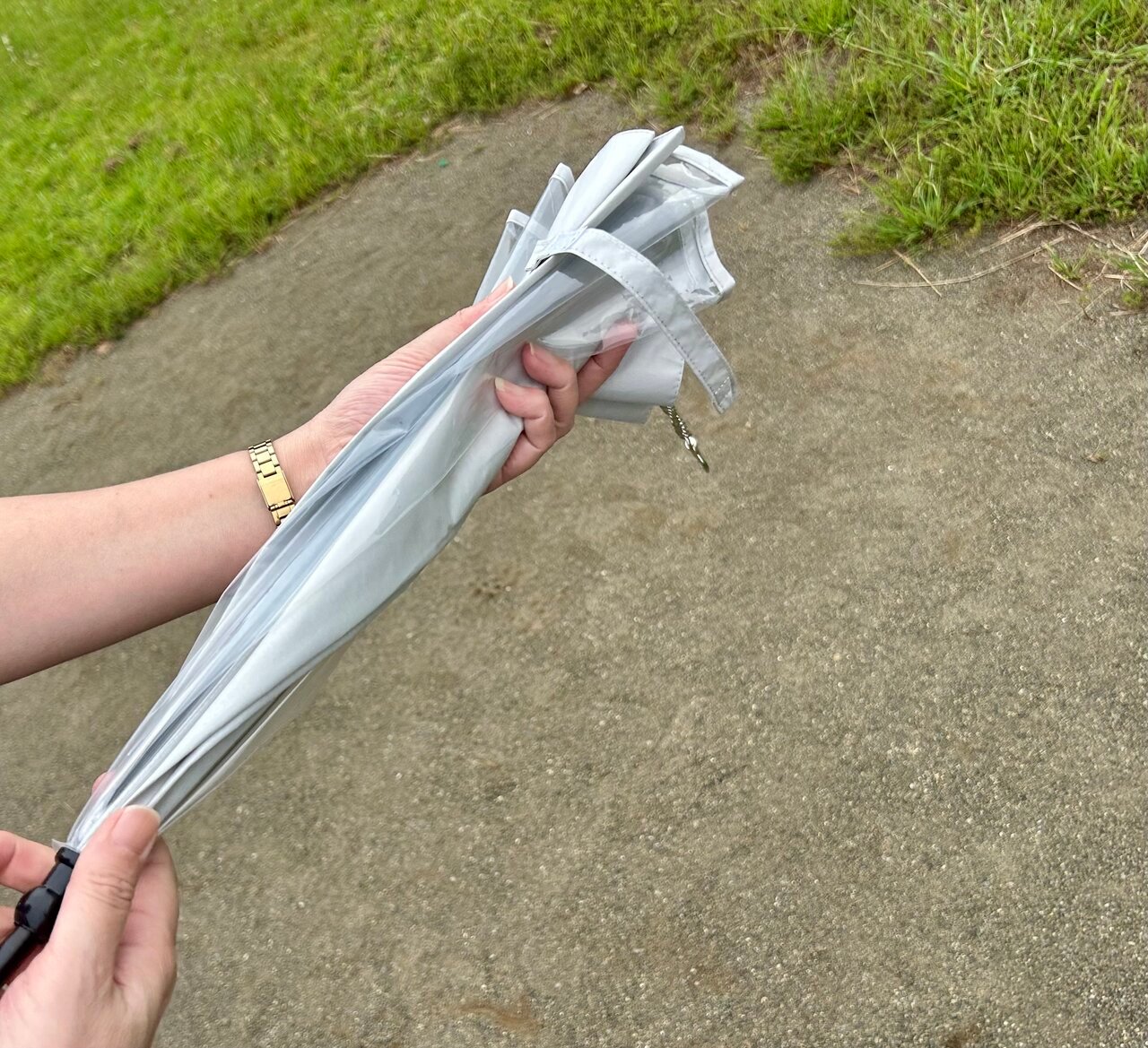お散歩傘は一般的な傘のようにまとめるだけ。持ち手部分を手にかけられるので、途中で雨が止んだ時もスムーズに持ち運べます。