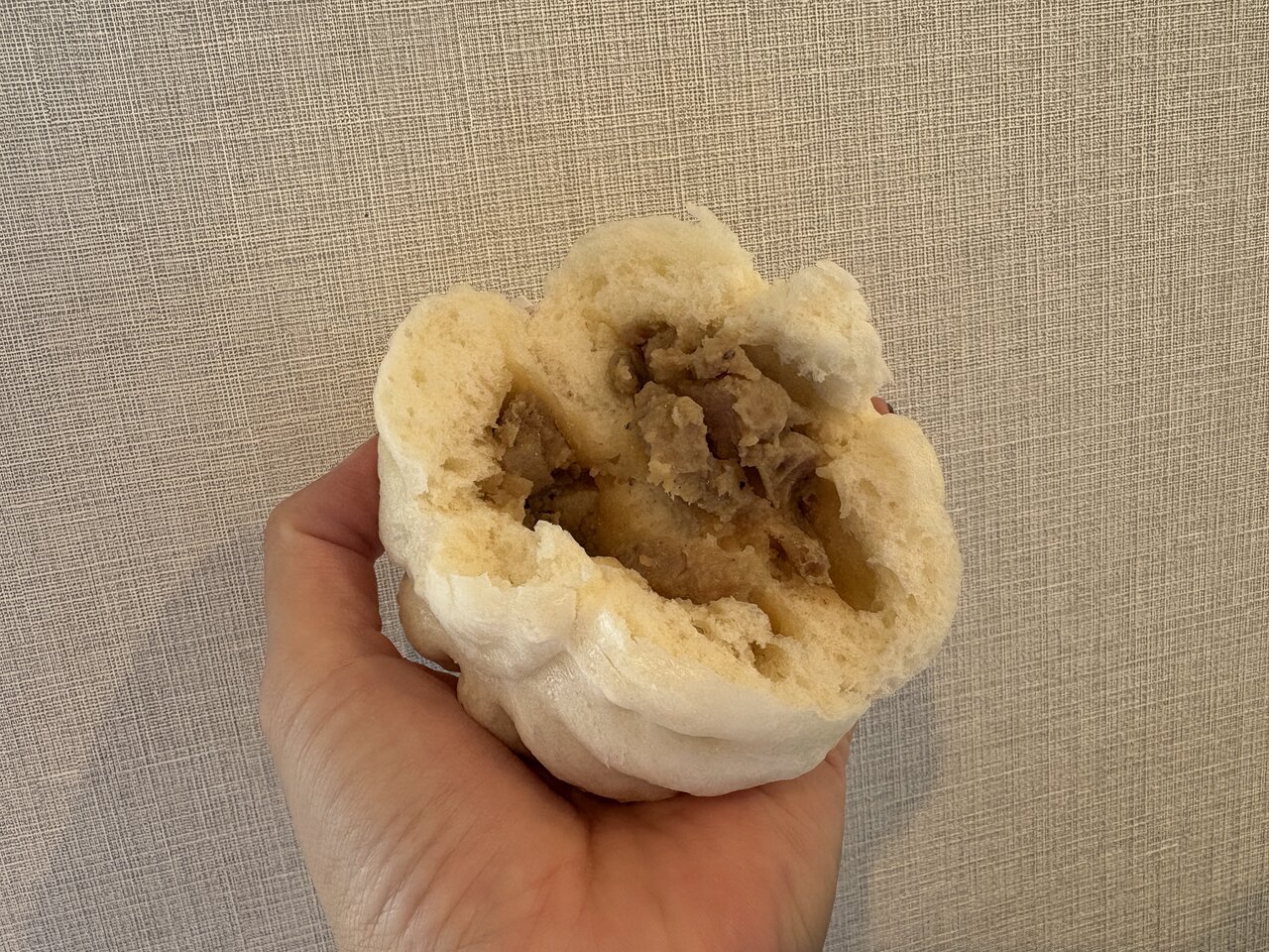 取り出した瞬間に手のひらへしっかりと温かさが伝わり、割った途端に湯気がふわっと立ちのぼりました。かぶりつくと、まだ「熱々」と言える状態で、食べるタイミングとしては理想的。移動後すぐに食べたい場合でも十分に満足できる温度を維持していると感じました。