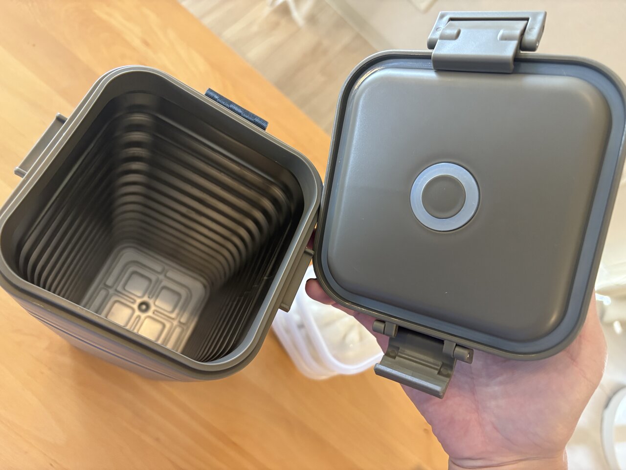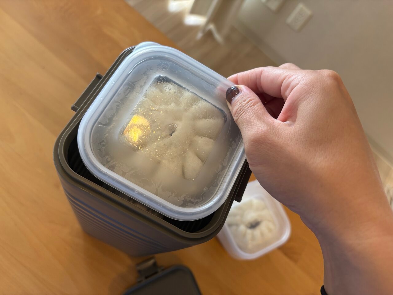 ちなみに肉まんを入れるのに使用した保存容器(タッパー)は、ダイソーの約10.3×10.3×5.4cm。肉まんを入れてちょうどフタを閉められました。ワークマンの2リットル対応スリム真空ハイブリッドコンテナコンテナにはタテに5つ入ります。