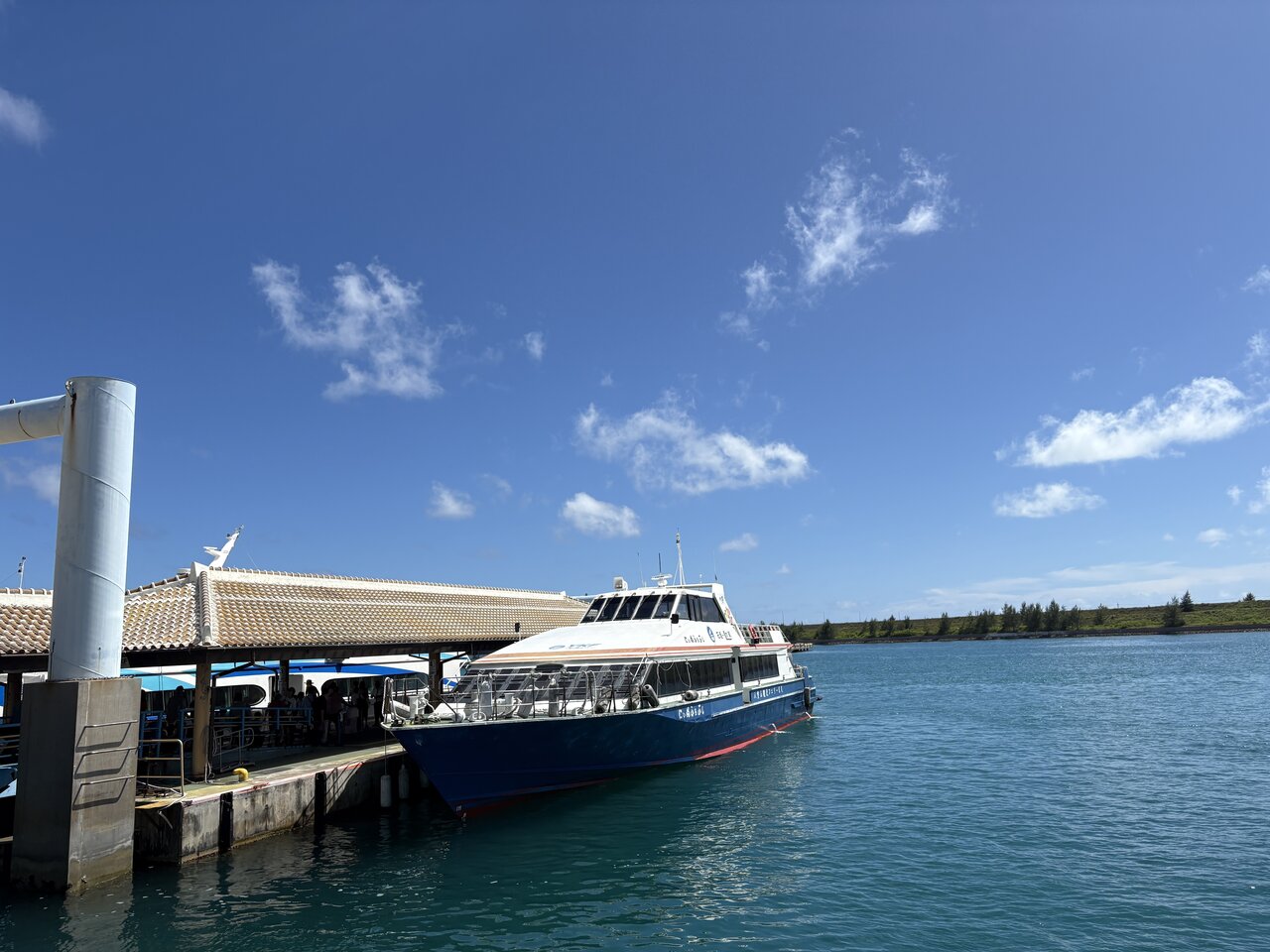 港に降り立つと、はいむるぶしの送迎バスが待っていました。こうして振り返ると、はるばる「島に来た」という実感があります。ここは普段の生活から切り離された非日常の入口、心から癒やされる準備は万全です。
