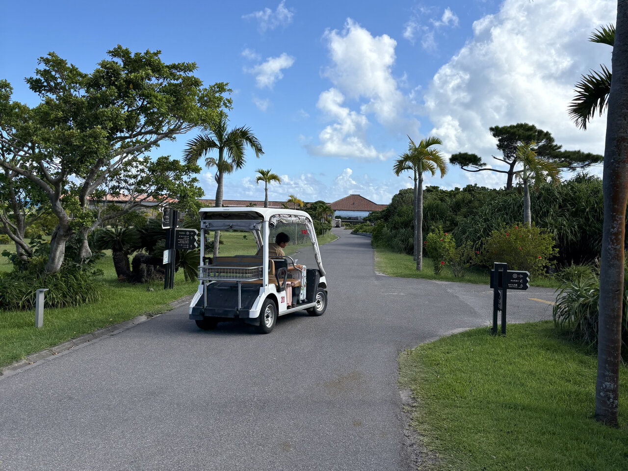 はいむるぶしはホテルでありながら、東京ドーム約8.5個分という広大な敷地を持つリゾート。滞在中は5人乗りのカートを借り、海やプール、ロビーなどへ移動します。