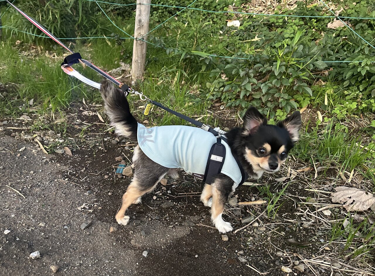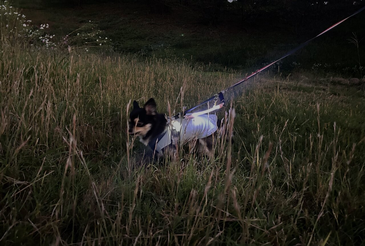 点滅モードにするとさらに高い存在感を発揮してくれるため、視界の悪い草むらでも目立ちやすくなり、暗道での散歩がグッと安心できるようになりました。電池式なのでお散歩バッグに替えを入れておけば、急な電池切れでライトが使えなくなった時も、慌てずにその場ですぐに対応可能。これはおすすめです。