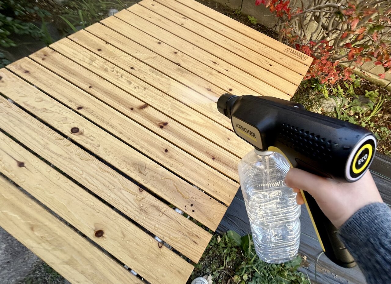 事前準備は本体をあらかじめUSB-Cで充電しておき、ボトルアダプターで2Lペットボトルを接続するだけ。ペットボトルの重量もあるので重いかも……と思っていたものの、ハンディエア本体が0.8kgとかなり軽量なので、片手で扱えました。