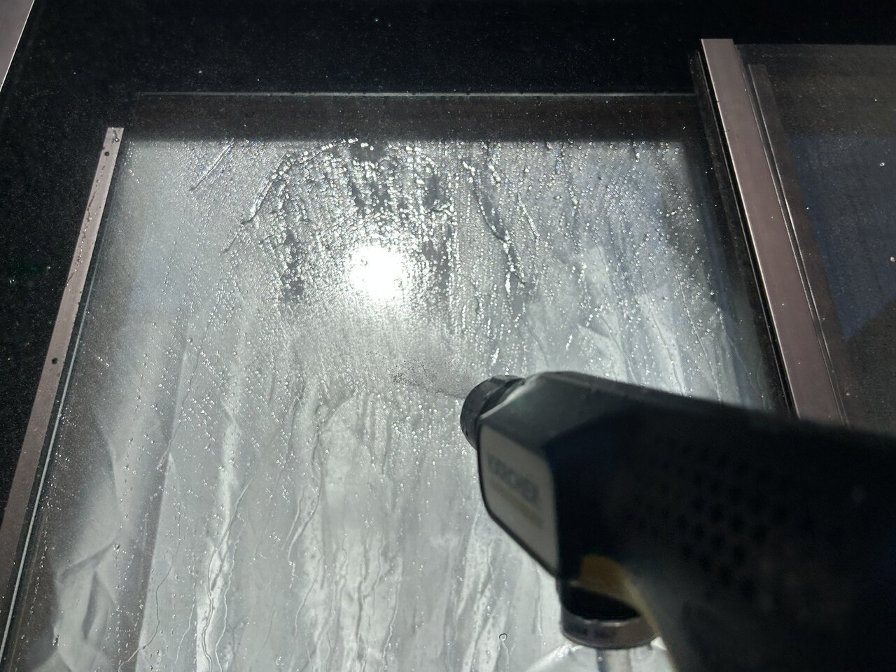 ハンディエアの最大許容圧力は1.5MPa。実際に噴射してみると数値以上にパワフルで、窓の近くにいると水しぶきが勢いよく跳ね返ってきてしまうので、少し距離を置いて狙い撃つのがコツ。