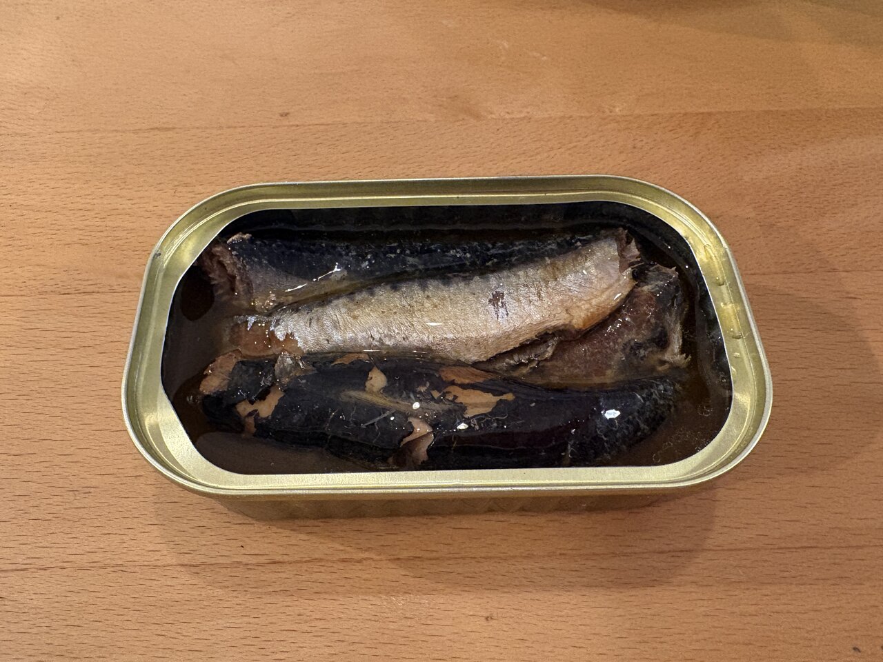 いわしオイル漬けを缶のままテーブルに置いてみると、油が表面に広がる実に男らしい光景。見た目としてはシンプルですが、食卓としてはやはり簡素な印象。