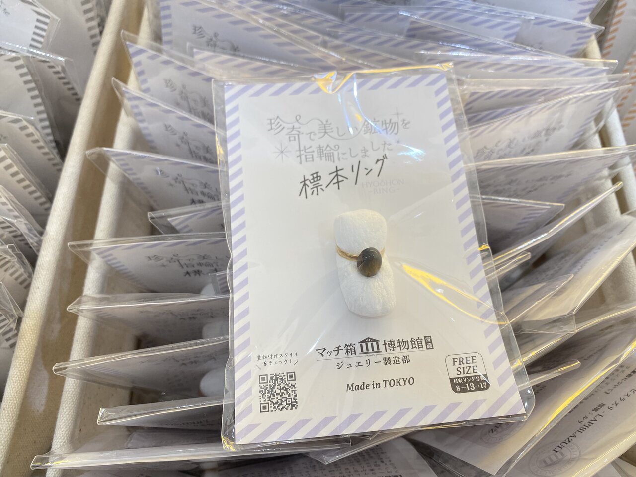 入った途端目に入ったのは、マッチ箱博物館の標本リング。「標本?」なのか「リング?」なのか、一瞬頭が混乱しましたが、こちらは本物の鉱物を使用ったリング(指輪)。標本のように集めたくなるようなリングです。