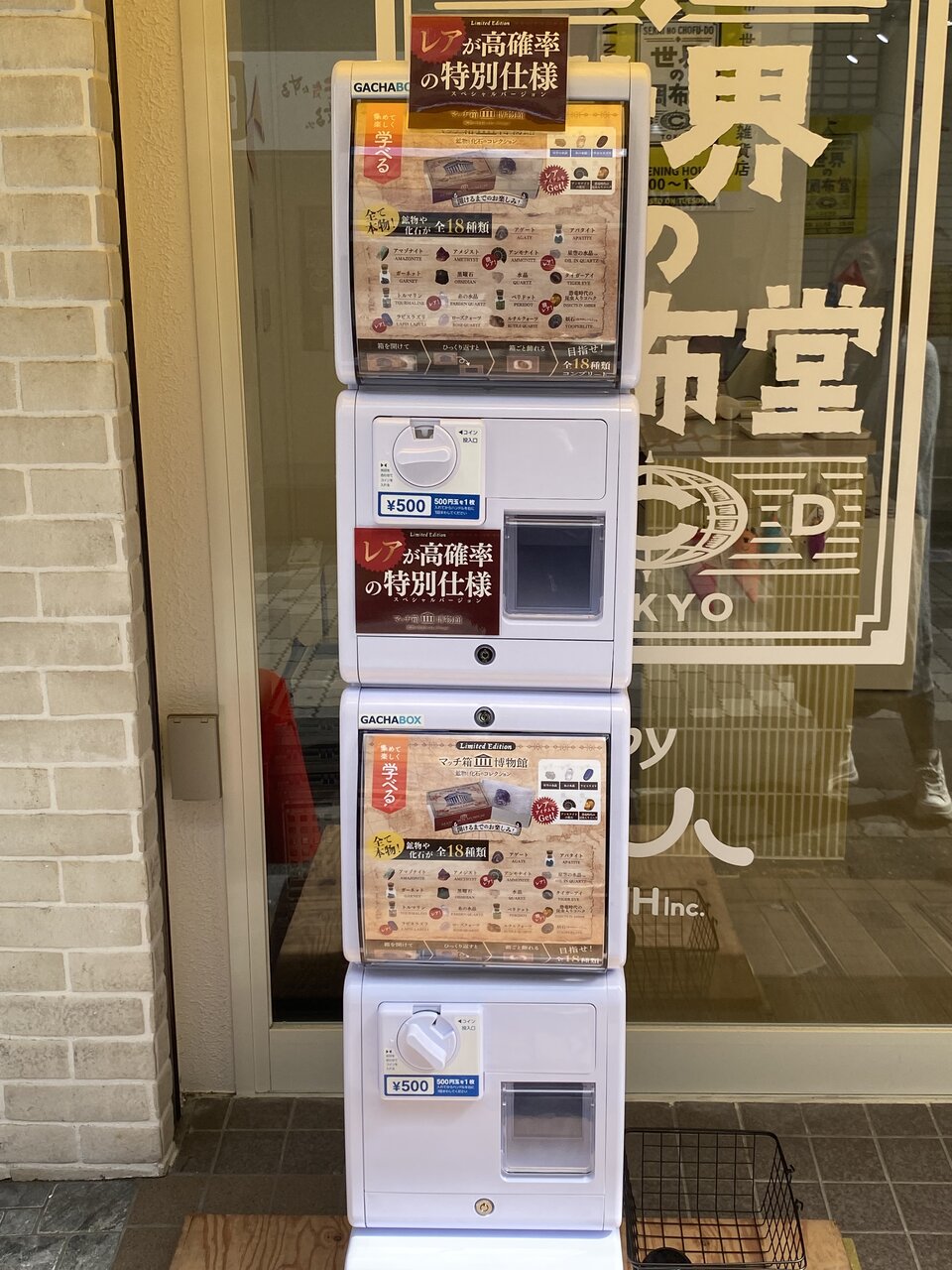 ということで、レアな「マッチ箱博物館」が集まっているという、ガチャの方にも挑戦。こちらは鉱物・化石が全18種類のうちの1種類が入っているということですが、アンモナイトは、レアアイテムの中でもさらにレアな「激レア」アイテム。店内の「マッチ箱博物館」よりも、ちょっと高価(500円)ですが、アンモナイトが欲しいんじゃ!