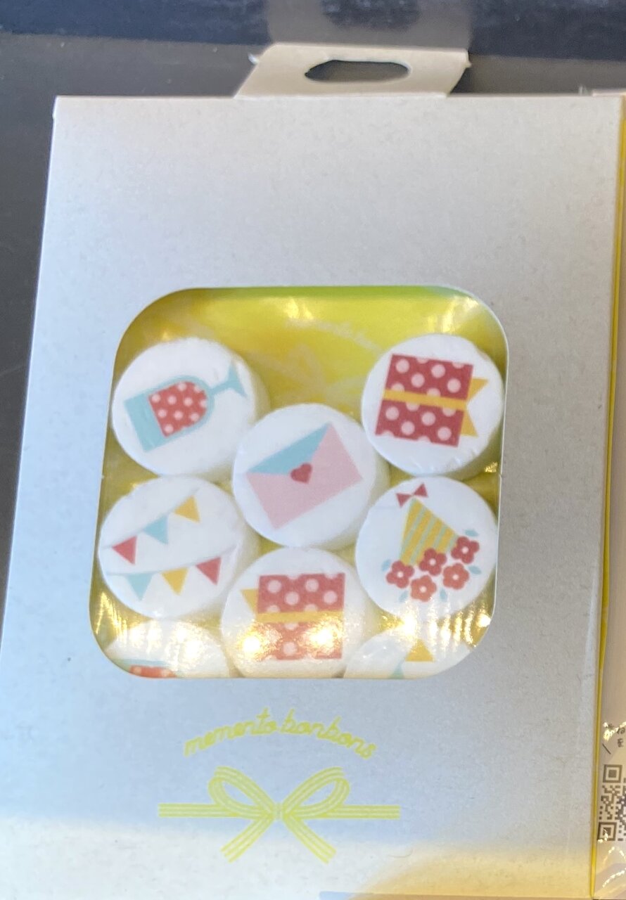ついでに反対側の壁には、カラフルなコーナーも。実はこちら、全部ラムネ! 500円玉サイズほどのノンアレルゲン・ラムネに、かわいいイラストがプリントされています。若者の就労支援を行う「コミュニティ工場」で製造されているそう。