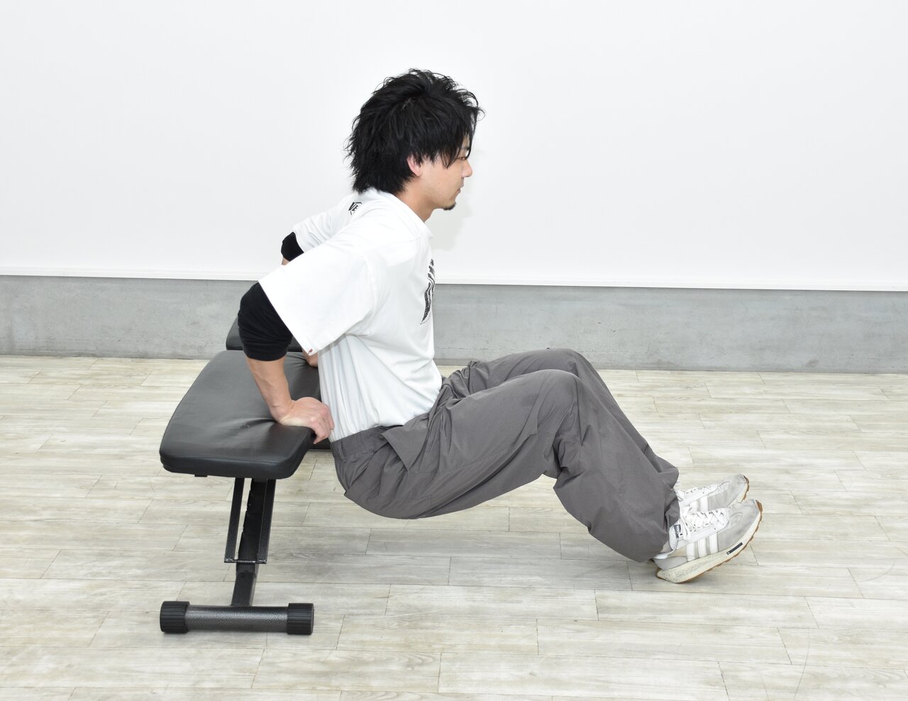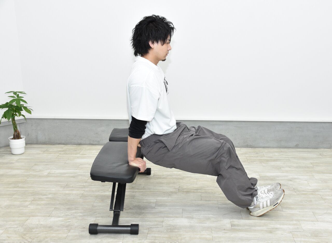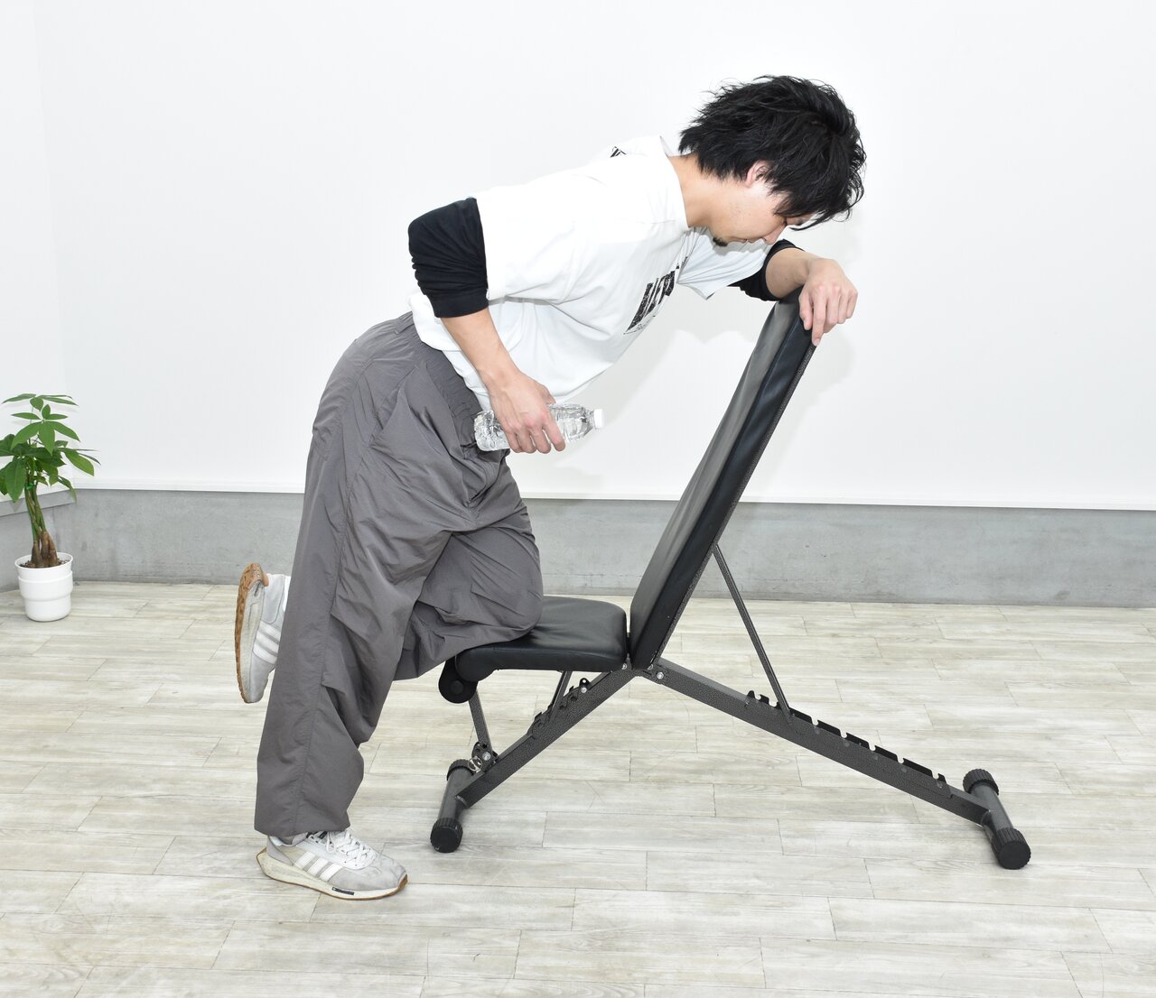 ― もし椅子がない場合は、上半身を少し倒して同じように行うといいでしょう。15回、3セット行います。