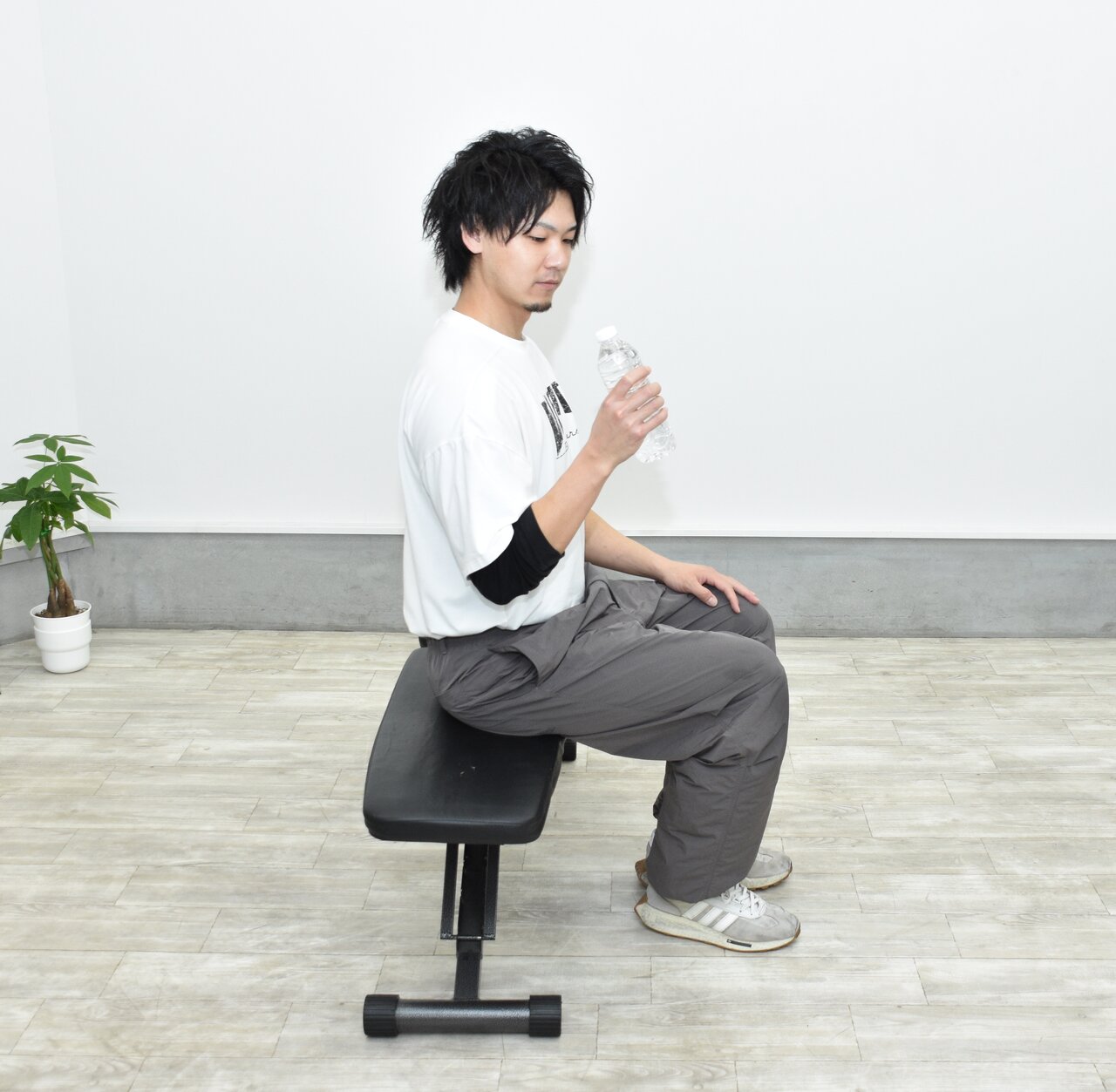 ① まず椅子に片膝を乗せ、片手を背もたれに乗せます。もう片方の手でペットボトルを持ち、脇より後ろに肘を上げます。