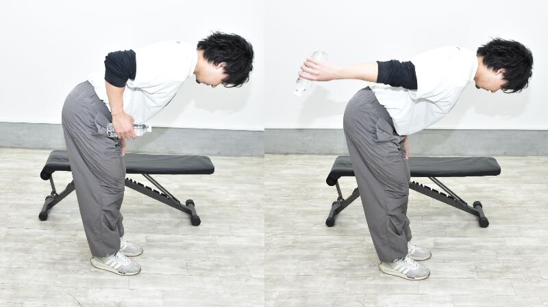 ③ ペットボトルを頭の後ろに下ろします。この上下運動を、15回、3セット行ってみましょう。