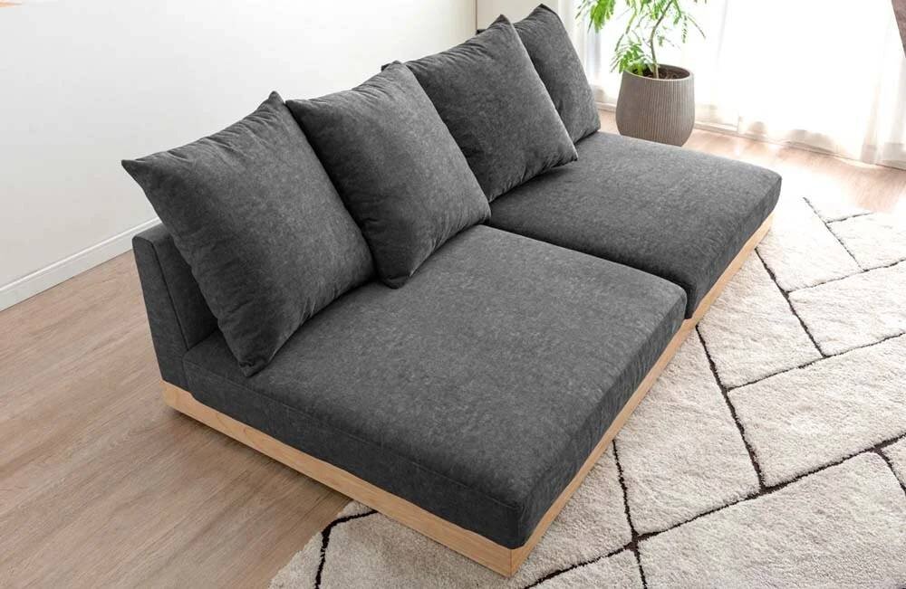 ひじ掛けのないアームレスデザインで、どこからでも座りやすく開放的。セパレートスタイルでも使えて、レイアウトも自由自在。座面サイズは幅180×奥行き80cmの超ビッグサイズ。大人2人が並んでもゆったり座れ、仮眠や昼寝をしても寝返りがうてる広さです。