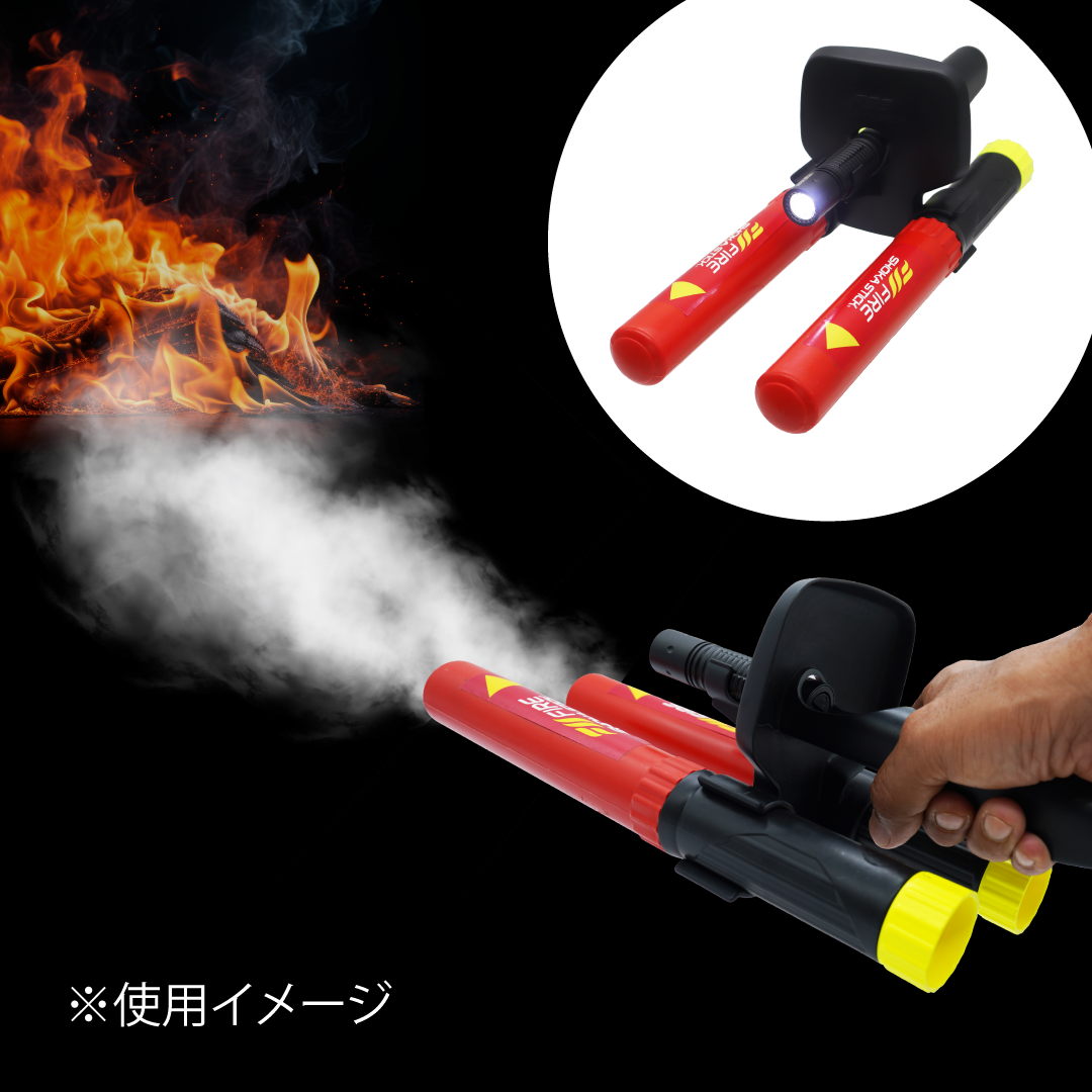 片手で2本のファイヤーショーカスティックを持てる専用ホルダー。LEDライト付きがついているので視界を確保しつつ、片手でより強力な初期消火を迅速に行えます。