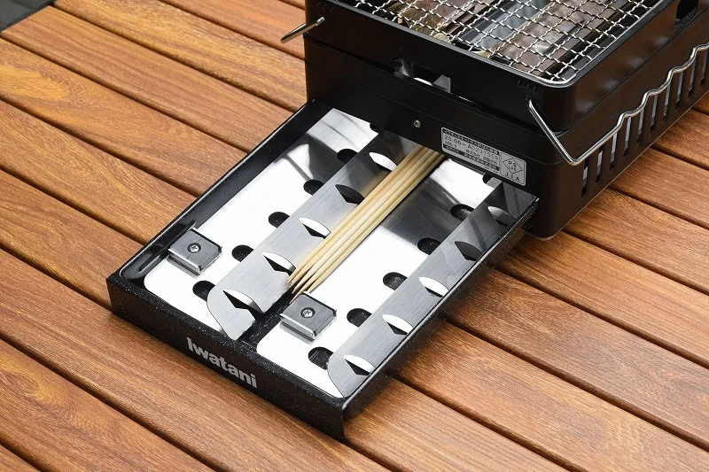 本体はステンレス製で、耐久性と清潔感を両立。イワタニ「炙りや」やアイリスオーヤマの炉端焼き器に対応し、水トレー内に2台まで収納可能です。