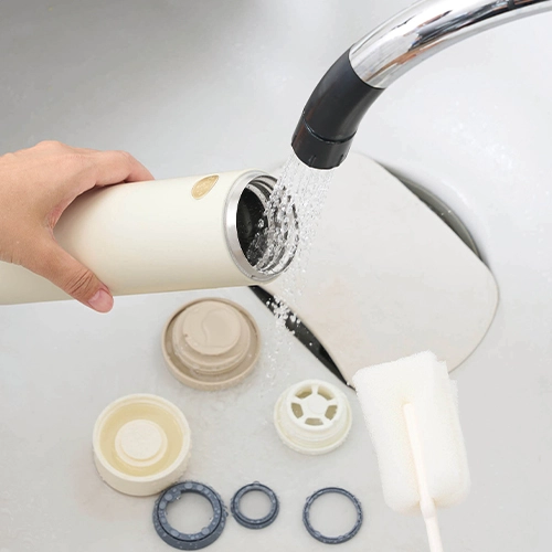 栓ユニット、底フタ、パッキンなど、すべてのパーツを分解できる設計を採用。細部まで、しっかり洗浄できます。シリコーンゴム製のパッキンはカビや臭いがつきにくく、毎日のお手入れも簡単です。