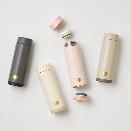 氷を押さえる飲み口は飲みやすさと実用性を両立しています。カラーはオフホワイト、ブラック、モカ、ピンクの4色展開。スタイリッシュでどんなシーンにも馴染み、ペアや家族で一緒に持つのもオススメです。