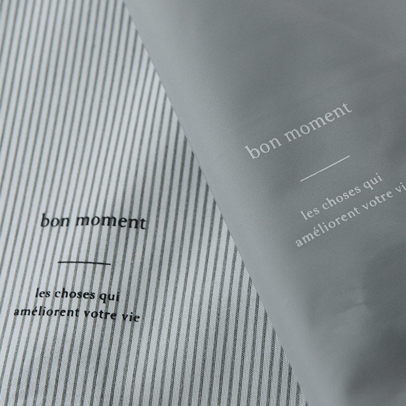高耐久なポリエステルのオックスフォード生地を使用し、何度でも繰り返し使えるスペックに。強い衝撃にも破れにくく穴も空きにくい、まるで布地のようなしっかりとした質感です。中身が透けないので、来客時や旅先で見えてもスマート。ロゴ入りのシンプルなデザインはユニセックスでも使用できそうな上品さです。