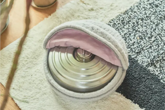 使うときは、本体をカバーに入れたまま付属のろう斗を使ってお湯を注ぎ、蓋を閉めたらチャックを閉じるだけ。直接熱くなった本体に触らず湯たんぽが作れるので、やけどの心配も面倒な準備も必要ありません。ちょっと面倒なこの一手間こそ、湯たんぽならではの“愉しみ”といえそう。