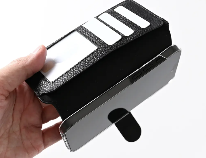 ケースのベルトは頑丈で、とめると財布にふさわしいホールド感に。さらに、背面を耐久性の高いポリカーボネート製を使用することで、ケース全体の強度が高められているんだとか。