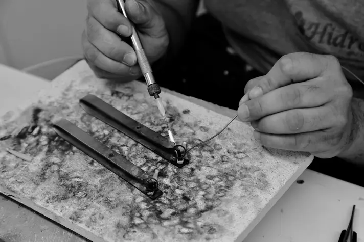 軸素材の艶やかなレジンやエボナイトと純銀のコントラストが重なることで、独特の色気が生まれるのも魅力です。クリップにはポケットの生地を傷めにくいローリング・ホイールを採用し、仕上げはすべて手仕事。仕上がったパーツは一見同じに見えても、「同じものは一つもない」と言えるほど、わずかな違いと個性が宿ります。