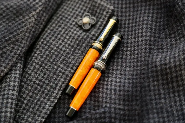 あえて「ミニ」から始まったこのコレクションは、当時の愛好家を驚かせたチャーミングなサイズ感と存在感が魅力。名刺サイズのM5手帳や小ぶりのノートにも収まり、ビジネスバッグやジャケットの内ポケットにもすっとおさまります。南イタリアの太陽光を思わせる鮮やかなオレンジに、スターリングシルバーやバーメイルのトリムが重なることで、大人のラグジュアリーを感じさせる一本に。