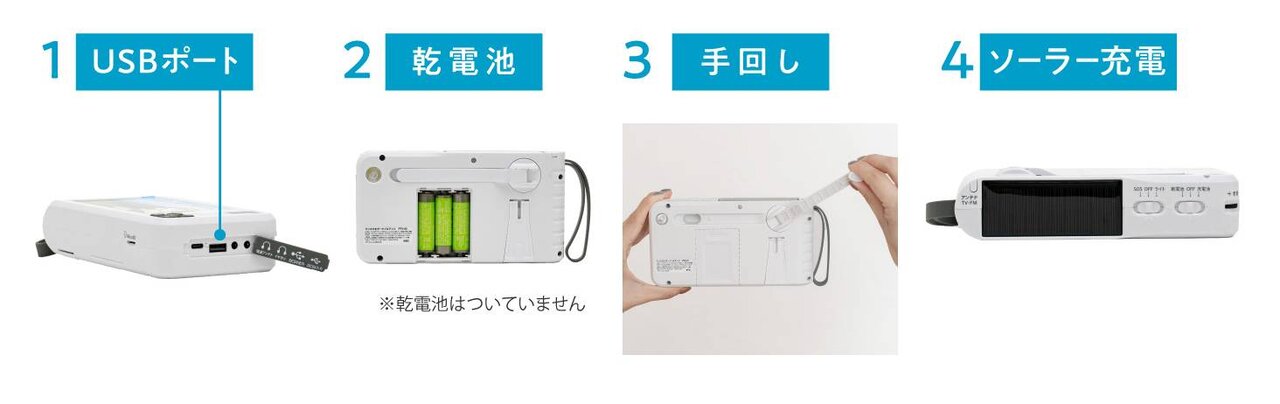 電源/内蔵リチウムイオン電池(2000mAh)、単3形乾電池×3本、ソーラーパネル、手回しダイナモ