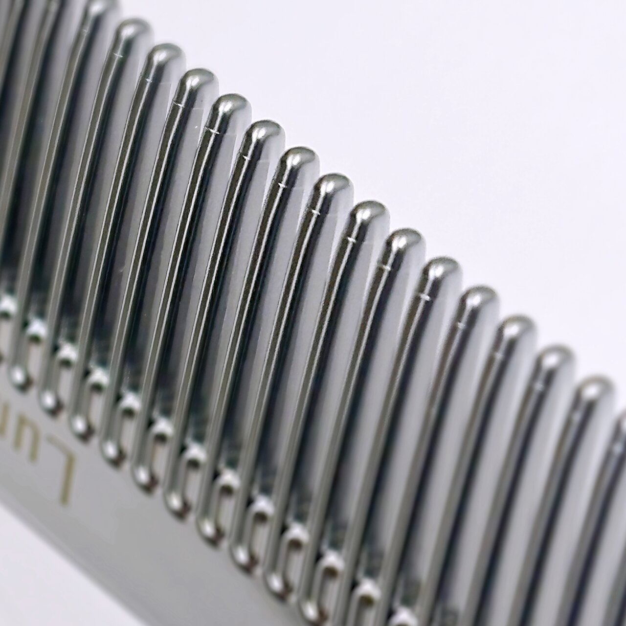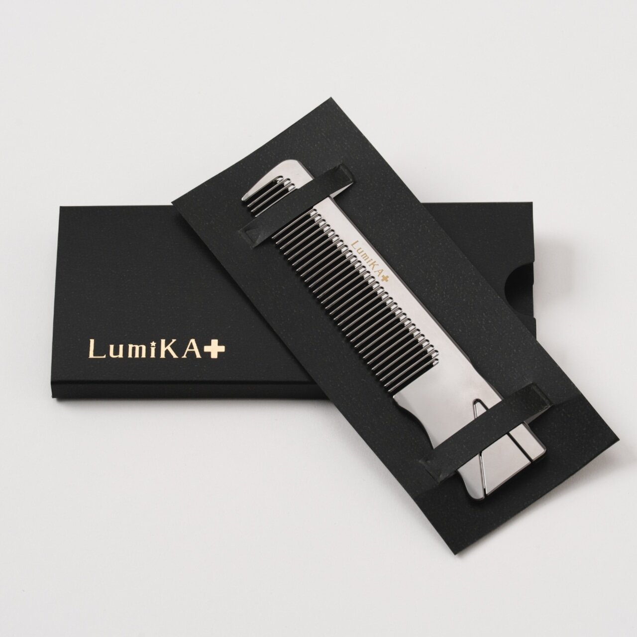 「LumiKA+ プラチナモノコーム」は、“静かに主張するおとなのツール”をコンセプトに掲げているコーム。特殊な樹脂めっき加工により、摩擦を極限まで低減させ静電気を逃がしてくれます。梳かすだけでキューティクルを整え、自然なツヤ髪に。コーム先端部は丸い加工が施されていて、頭皮をいたわれる優しい肌あたりを実現しています。