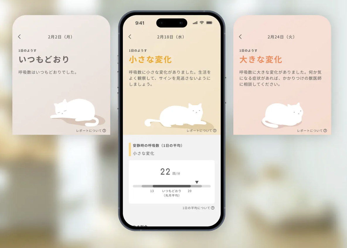 呼吸数はアプリで確認できるよう。日々の計測結果をもとに、猫ちゃんの状態を“いつもどおり”、“小さな変化”、“大きな変化”の3段階で知らせてくれます。変化があった時のPUSH通知機能も搭載しているため、万が一の時も安心です。